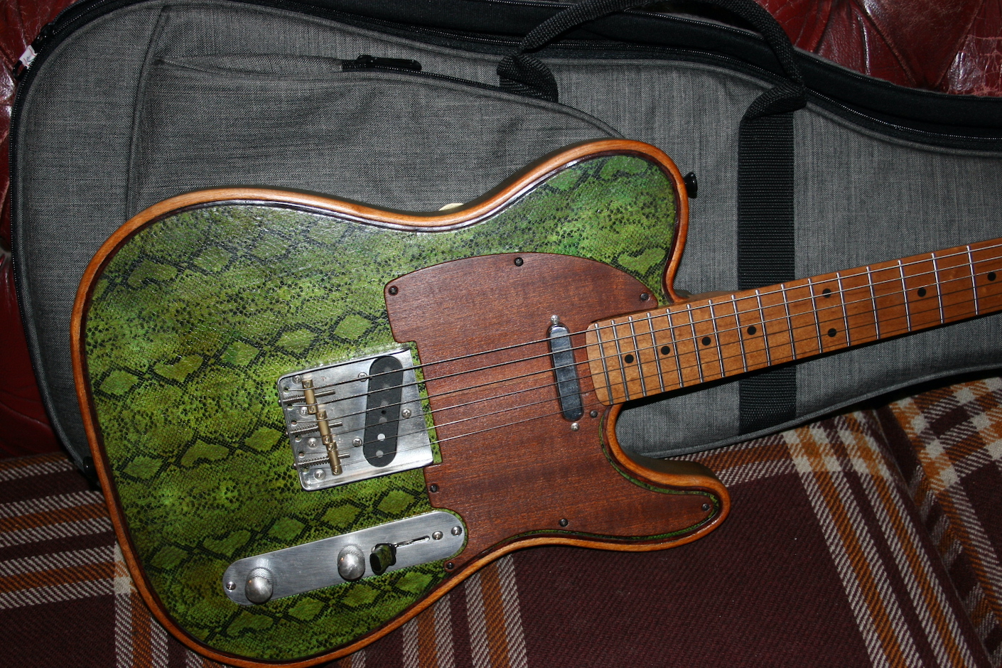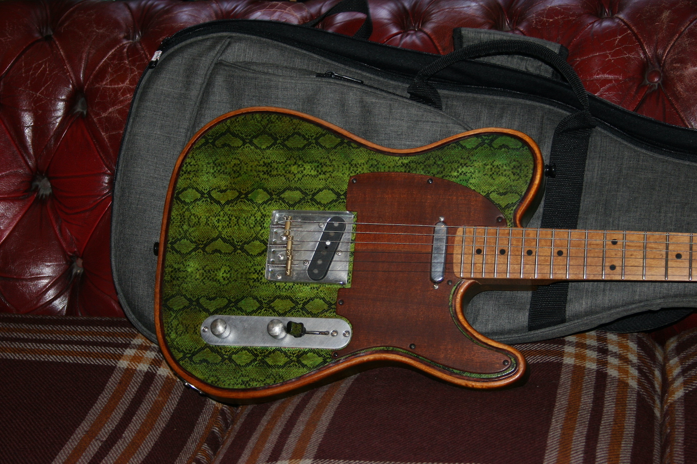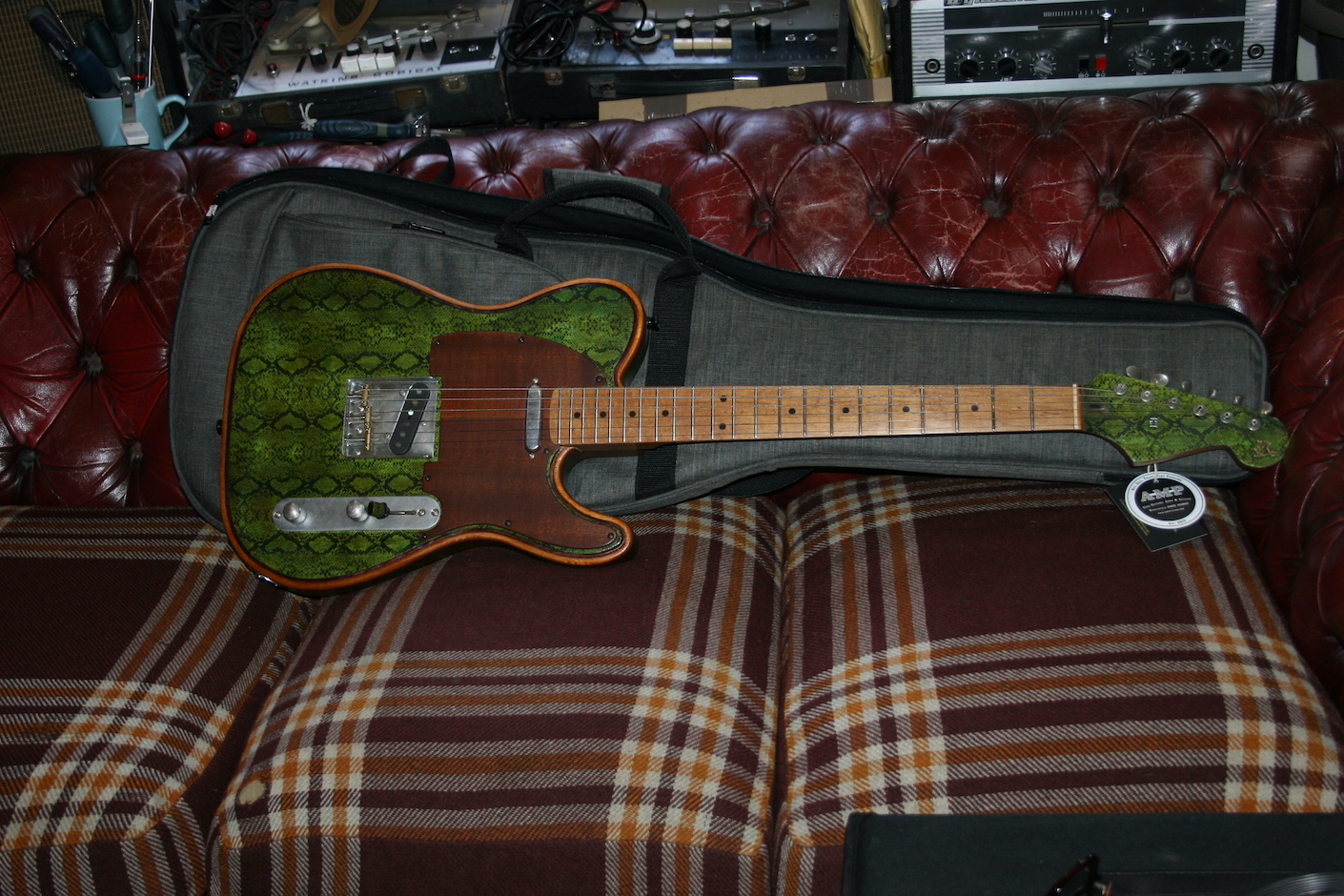Very cool Camden Guitars London T-Type hand made with a Snakeskin inset finish. The body is made from an old table I believe.