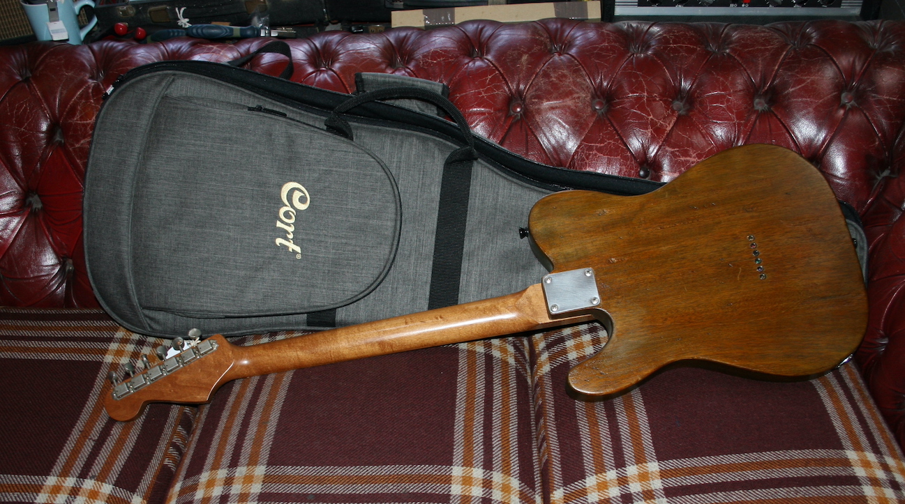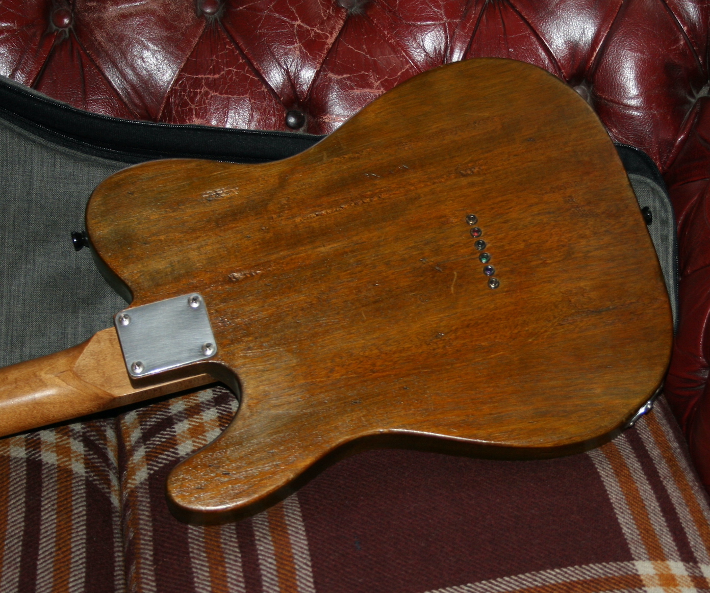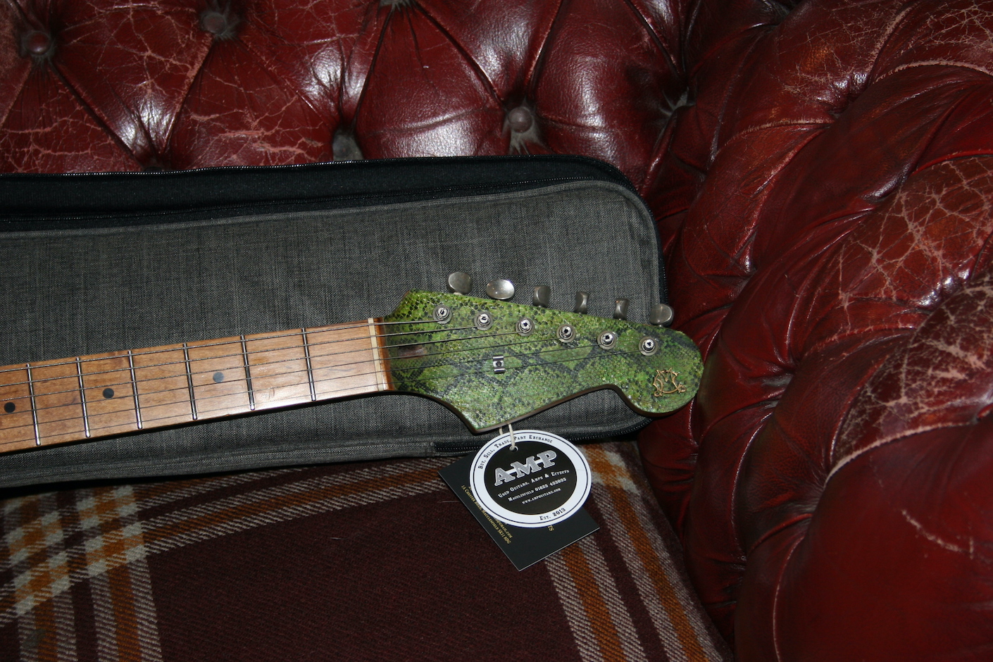 Very cool Camden Guitars London T-Type hand made with a Snakeskin inset finish. The body is made from an old table I believe.