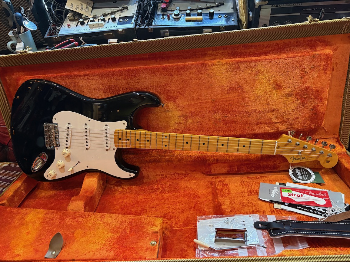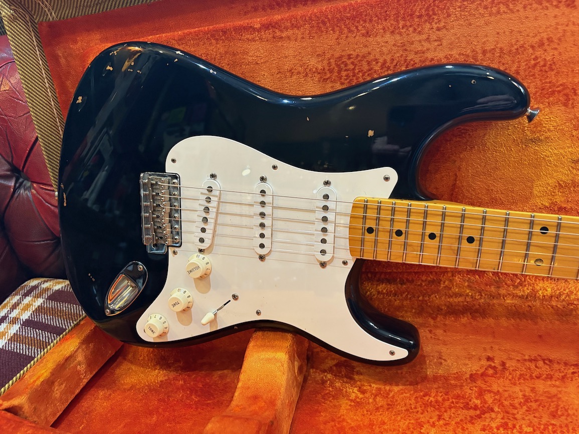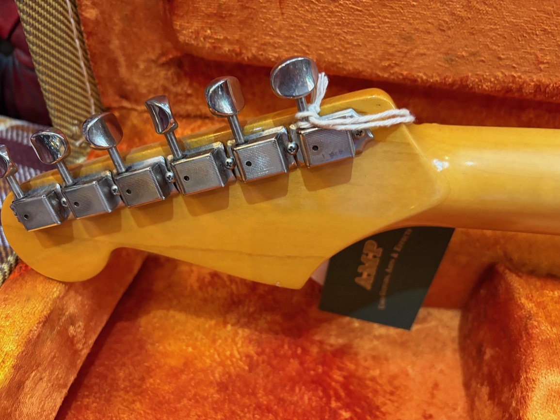 Fender 2011 ’57 American Vintage Reissue Stratocaster. Lots of marks to the body, frets are very clean as is the board. This has been loved and played a lot! And with good reason, this is one very vibe guitar. The maple neck feels fantastic with the soft V. A slinky player too. Original 3 way switch.