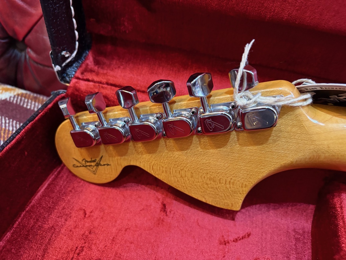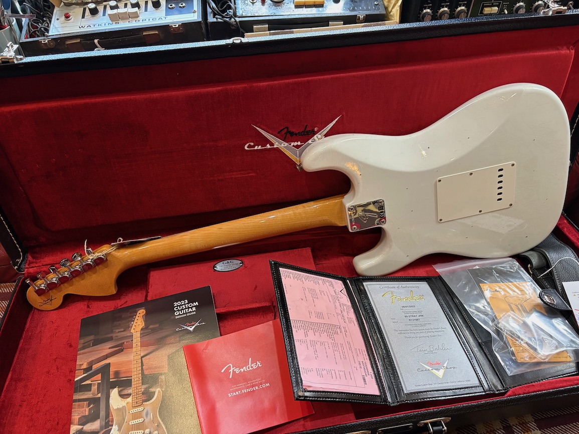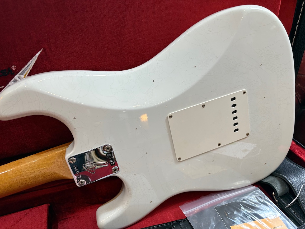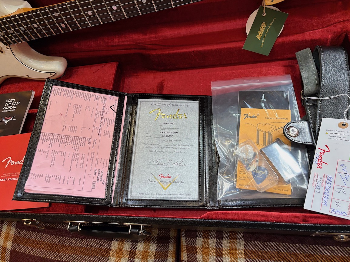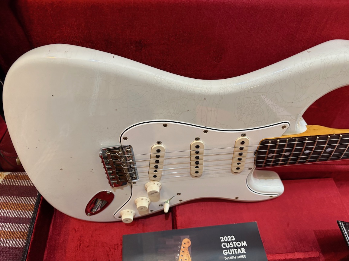 Stunning fender 2023 Custom Shop Journeyman Relic ’69 Stratocaster in a wonderfully aged Olympic White. All the ’69 appointments, large headstock, truss at the butt and 4 bolt neck.
