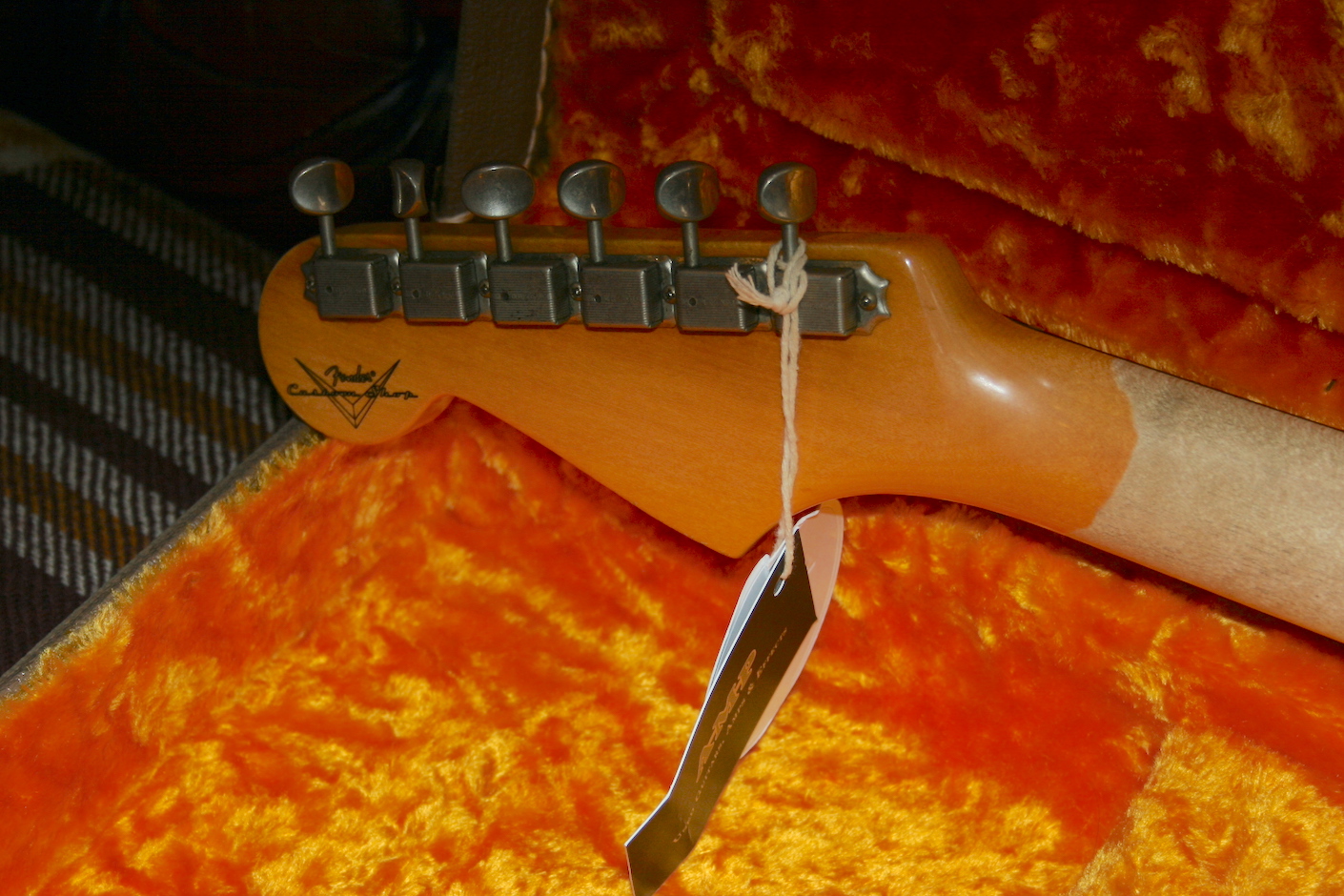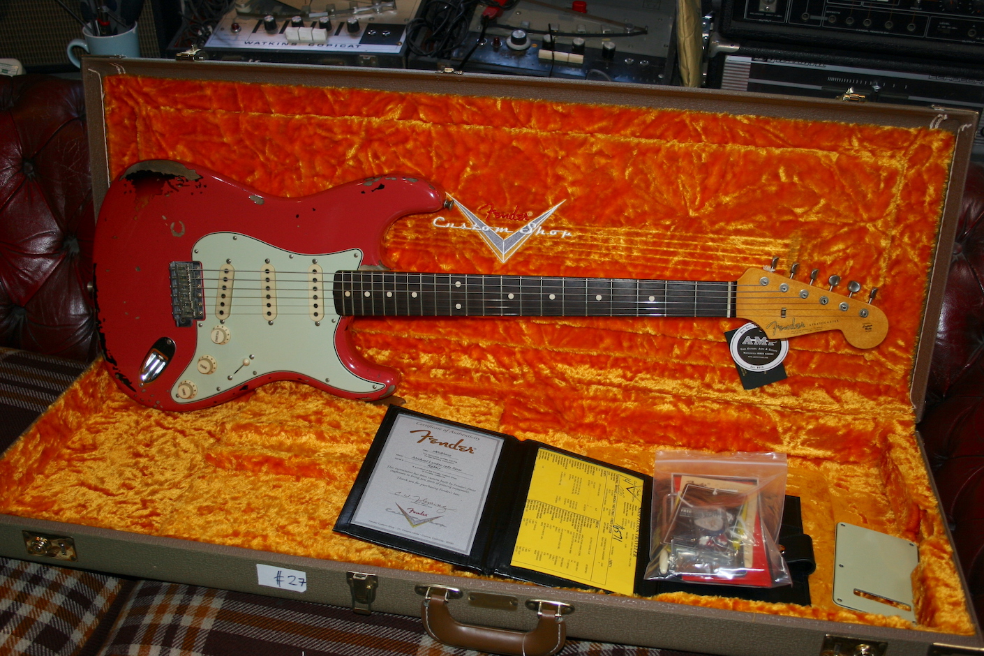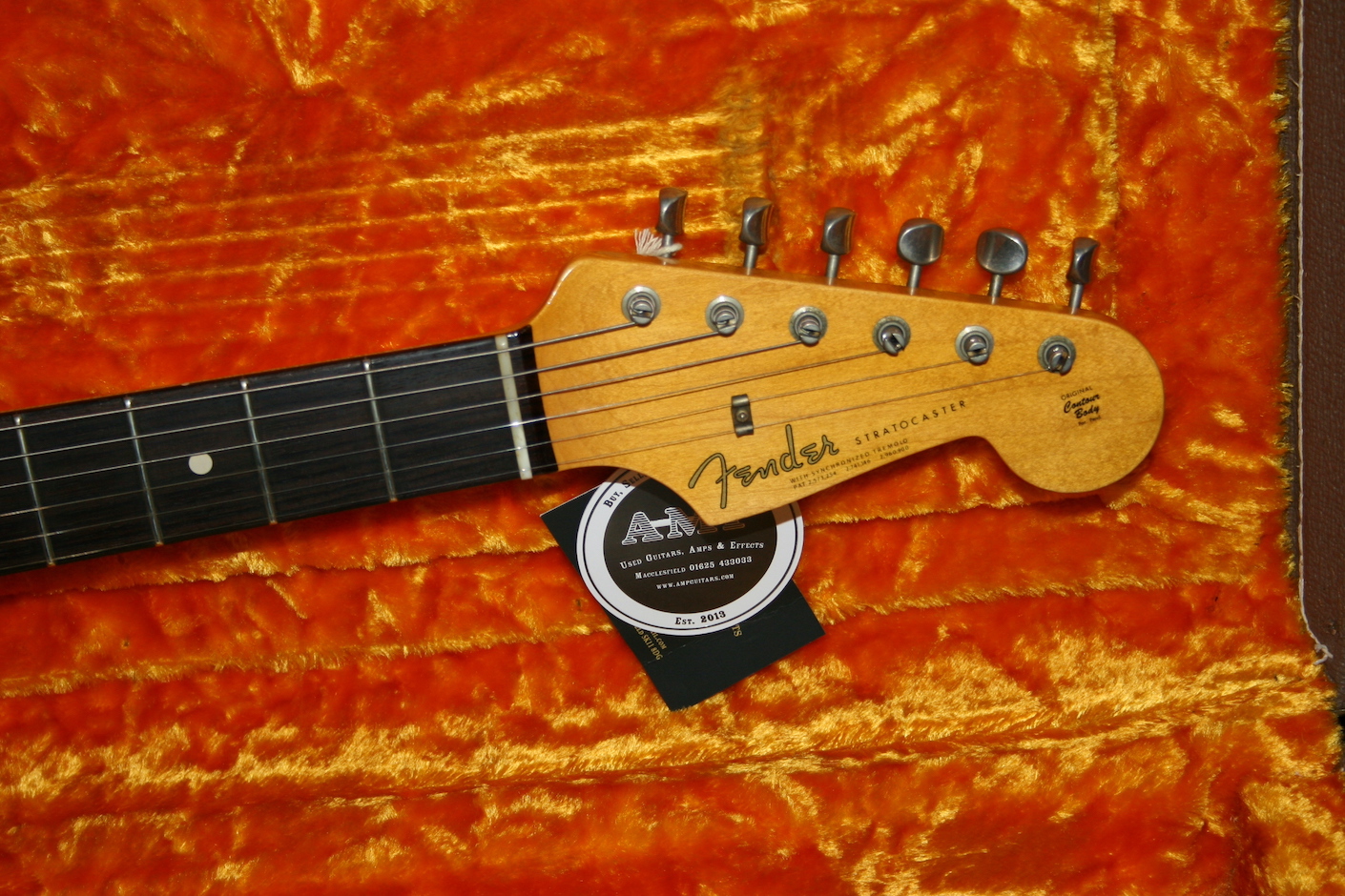 Comes with Cert, floor traveller, trem arm, back plate, tags and original Brown Fender hard case.