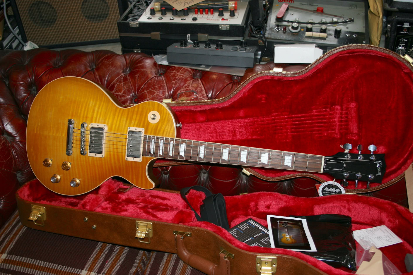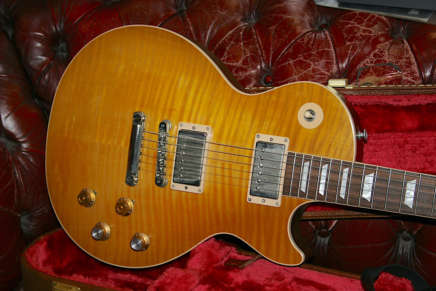 Great spec, fat ’59 neck and Greenybucker pickups with reversed neck magnet for the out of phase sound that goes hand in hand with this. One small mark as pictured the top edge.