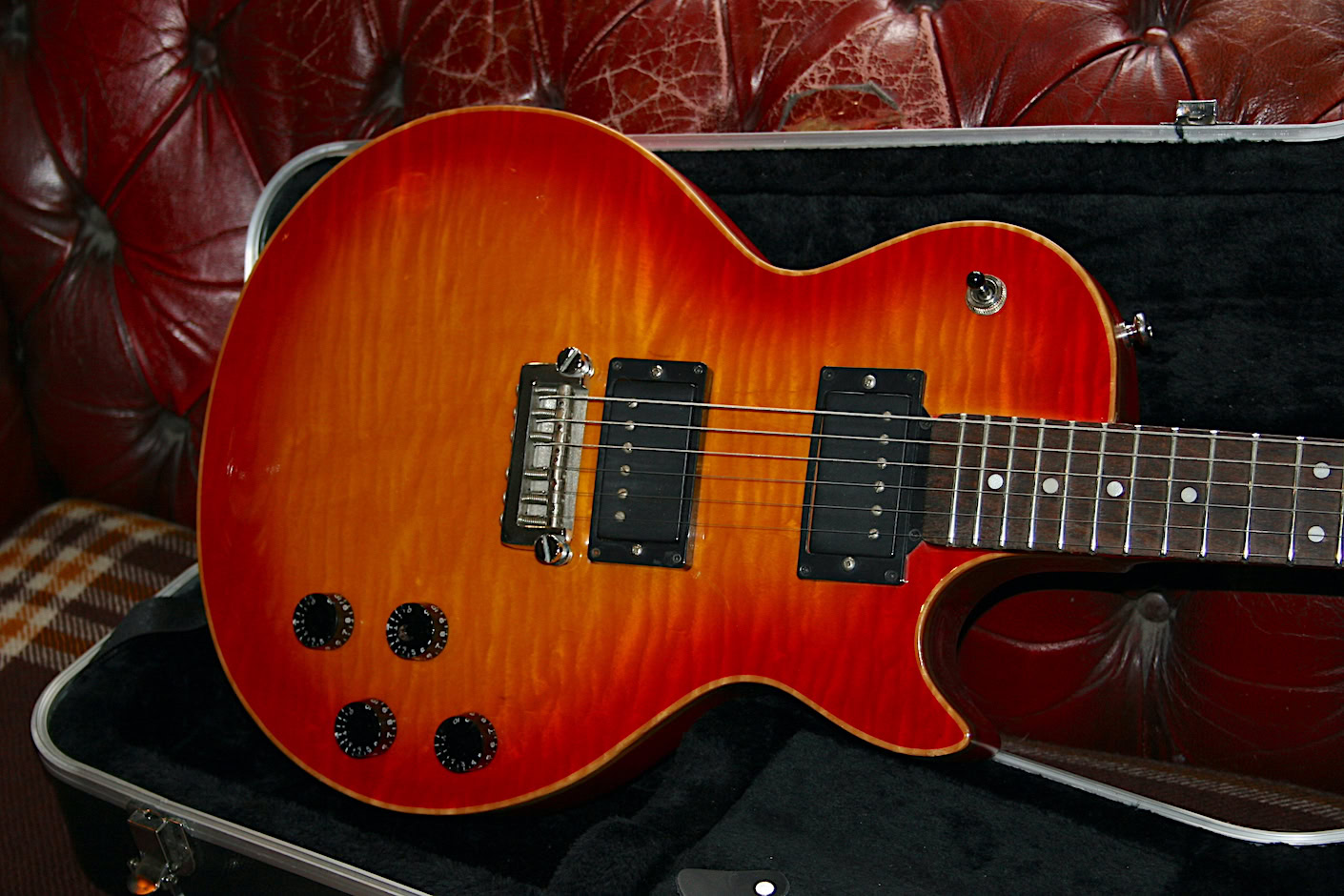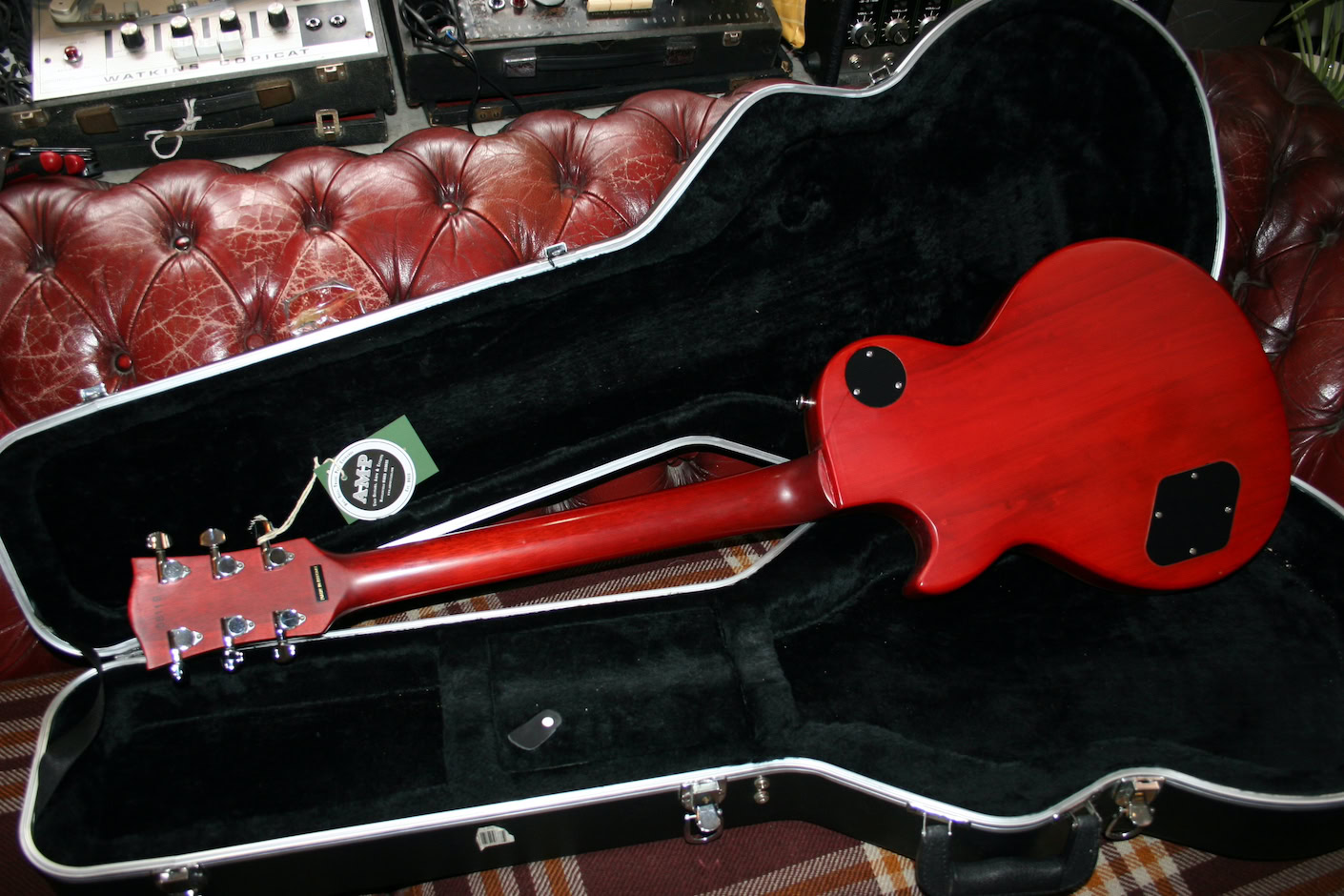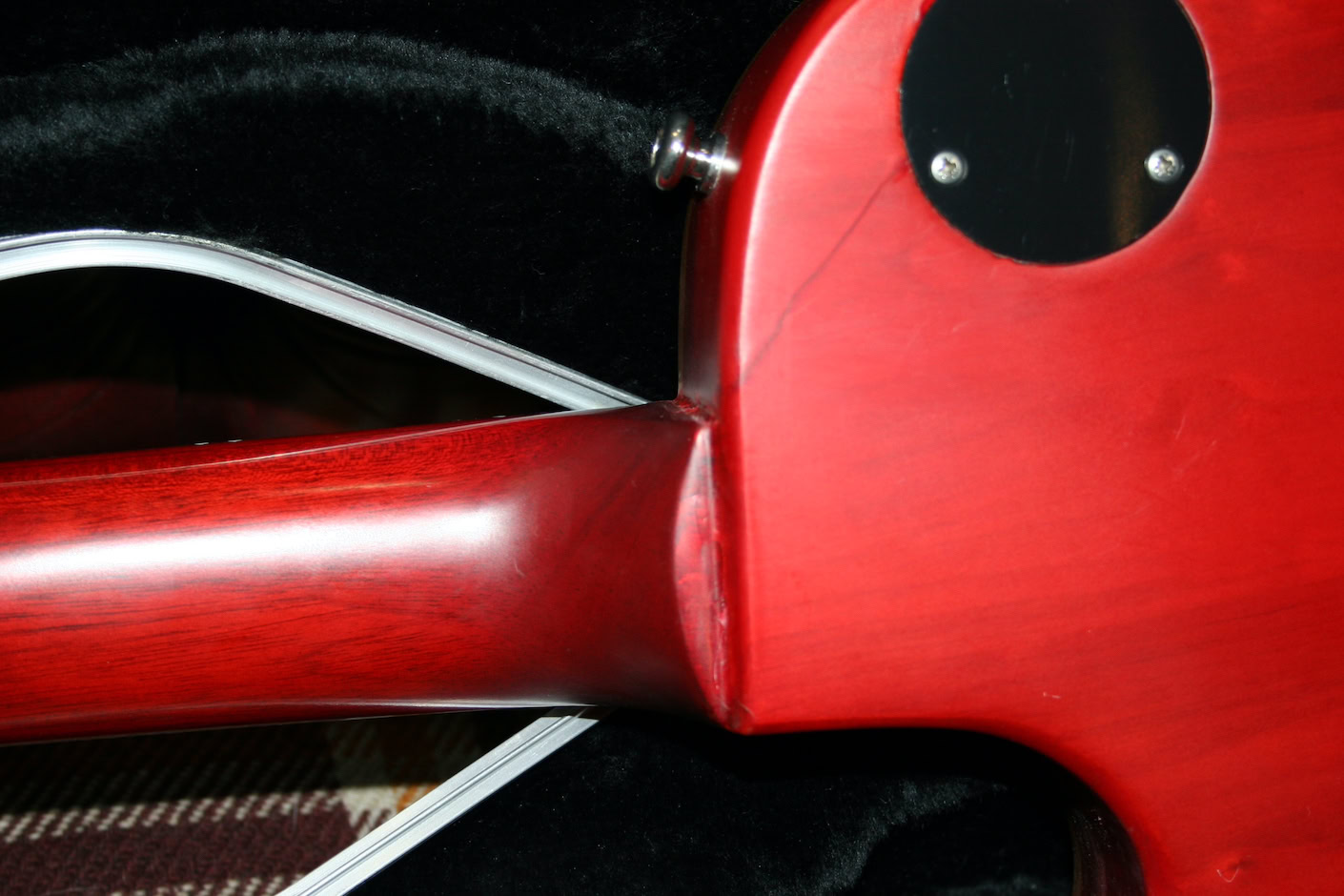 Slim neck but now overly skinny as some can be. Some minor lacquer checking becoming visible on the gloss top on places and to the satin rear on the heel area and the cut away where the lacquer is lifting a little. No repairs!. The black line you see near the rear toggle cover is grain.