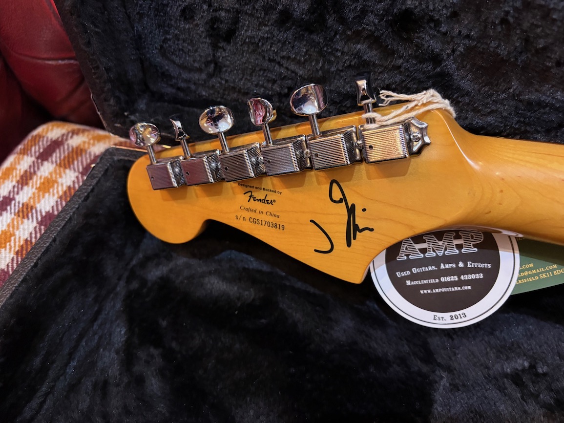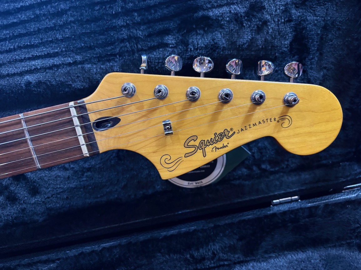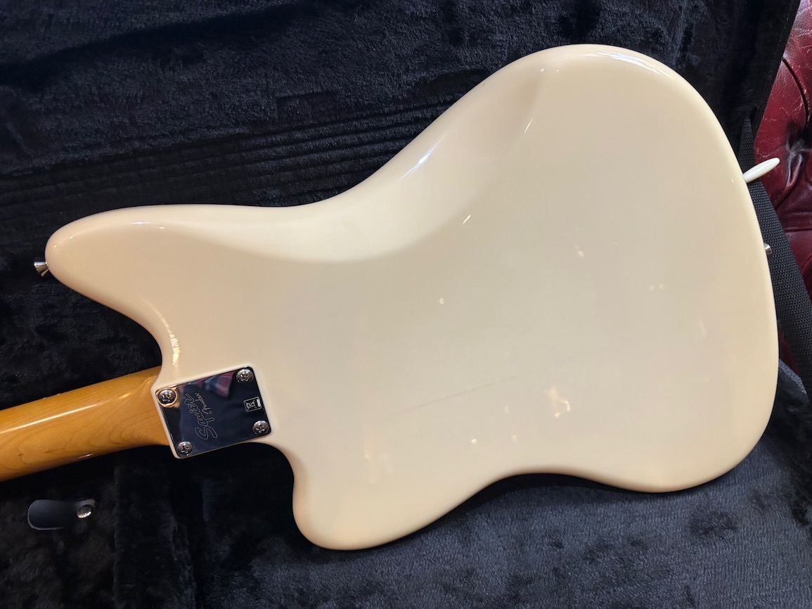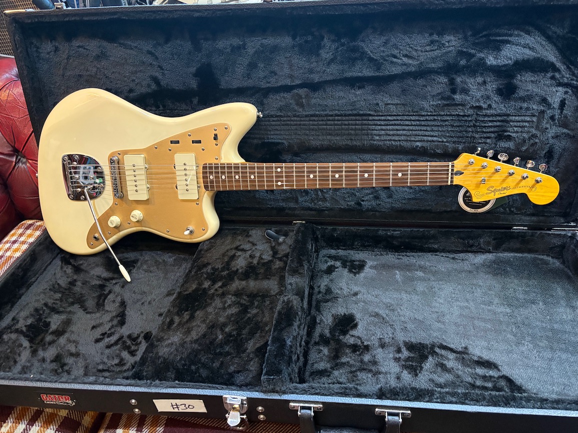 Squier J Mascis Jazzmaster in a cool Vintage White with gold anodised guard, such a brilliant and classic colour combination.